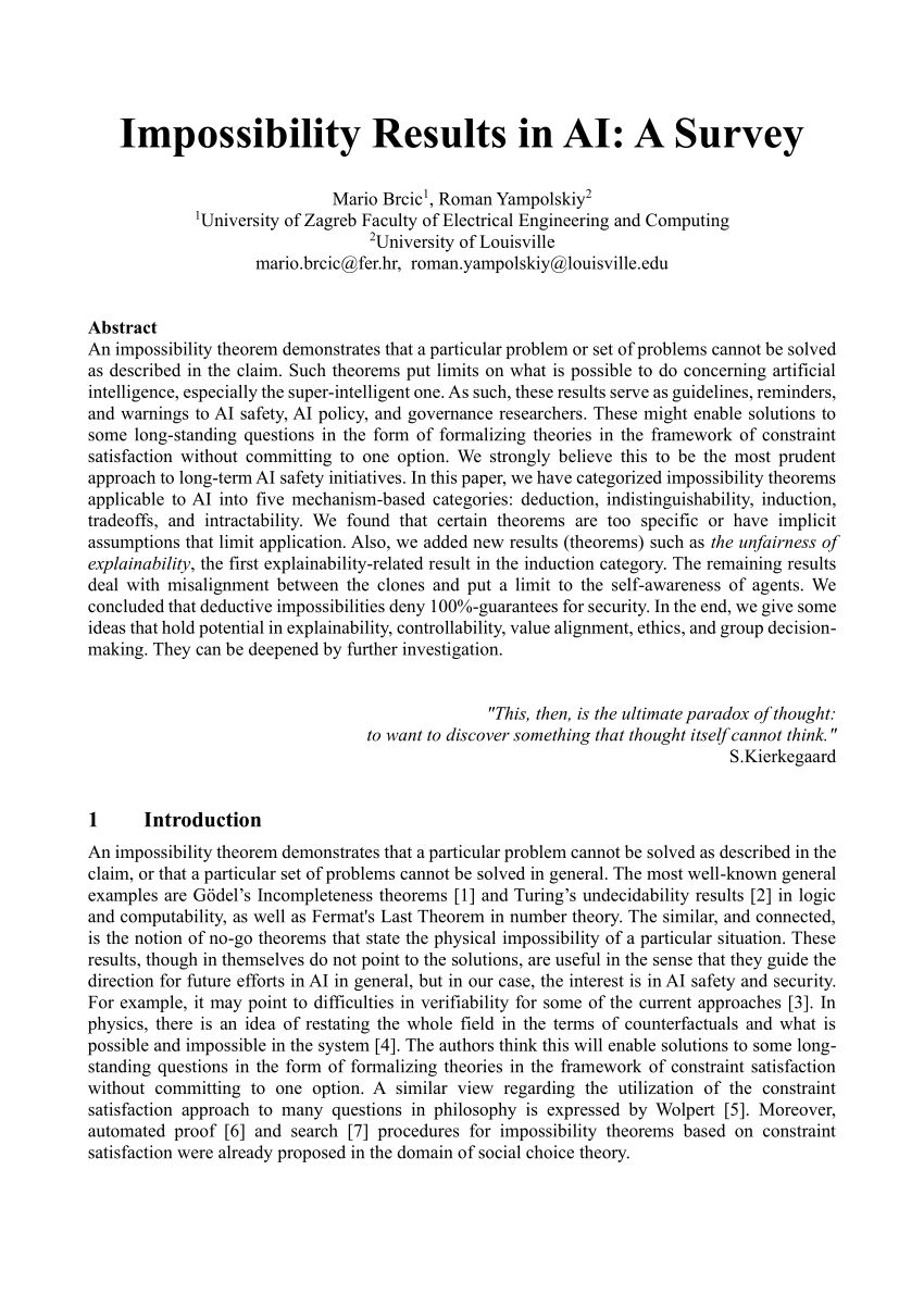 20. Brcic, M. and R.V. Yampolskiy, Impossibility Results in AI: A Survey. arXiv preprint arXiv:2109.00484, 2021.